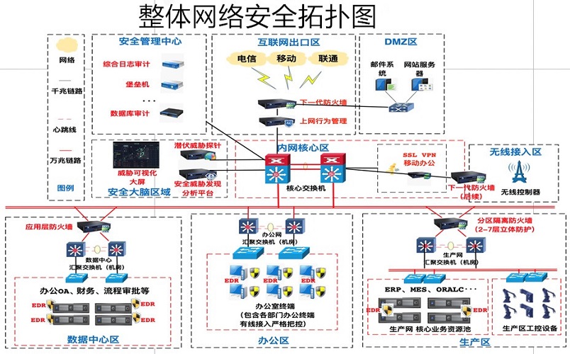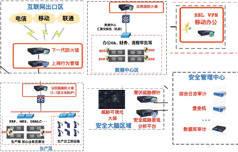 硬件設(shè)備:邊界下一代防火墻(出口邊界)、上網(wǎng)行為管理、分區(qū)防火墻、移動(dòng)辦公安全