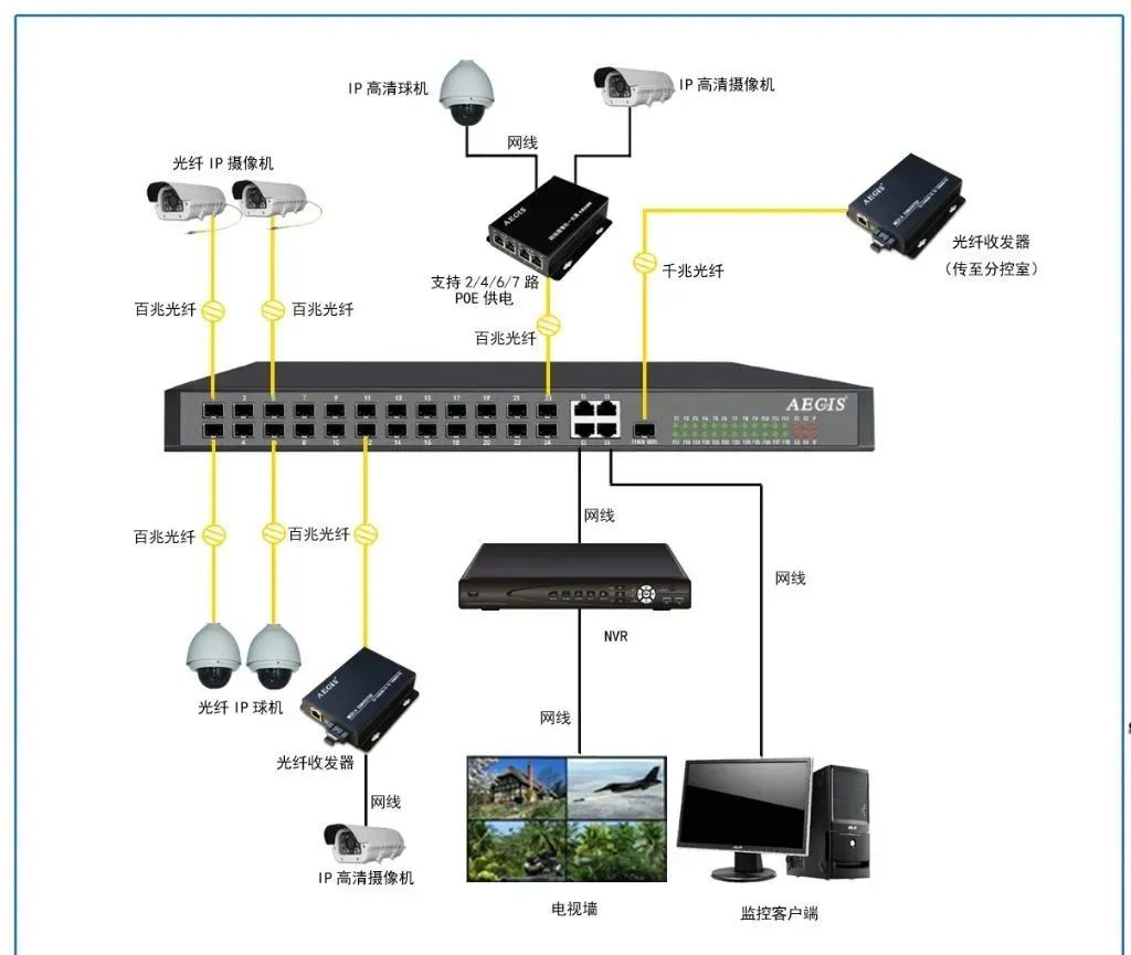 三、光纖架構:網絡攝像機+光纖+收發器