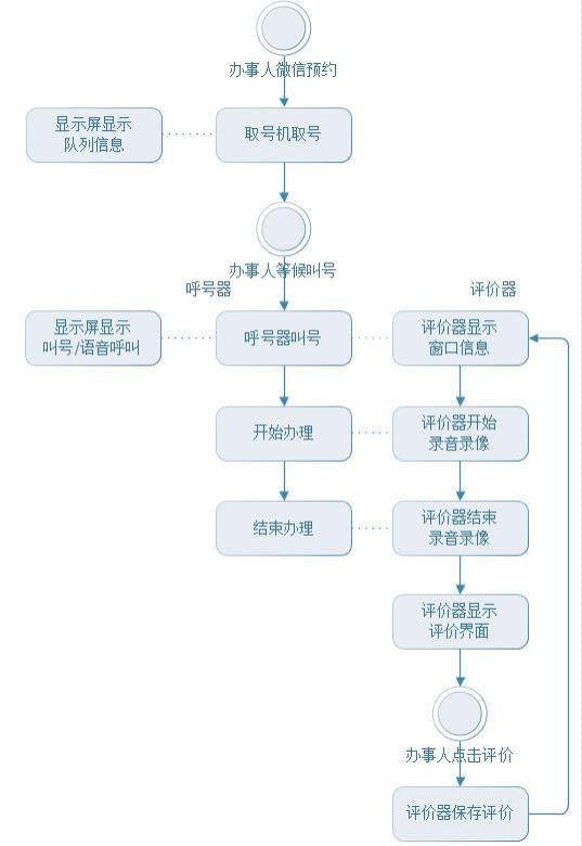 2、排隊叫號: 取號機取號、服務窗口呼號(包括呼號、開始辦理、結束辦理) 、排隊提醒、辦事評 價;