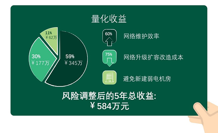 • 弱電機房投資:免取電的無源分光器取代傳統有源匯聚交換機,大幅節省機房投資,五年總收益現值超62萬元人民幣。
